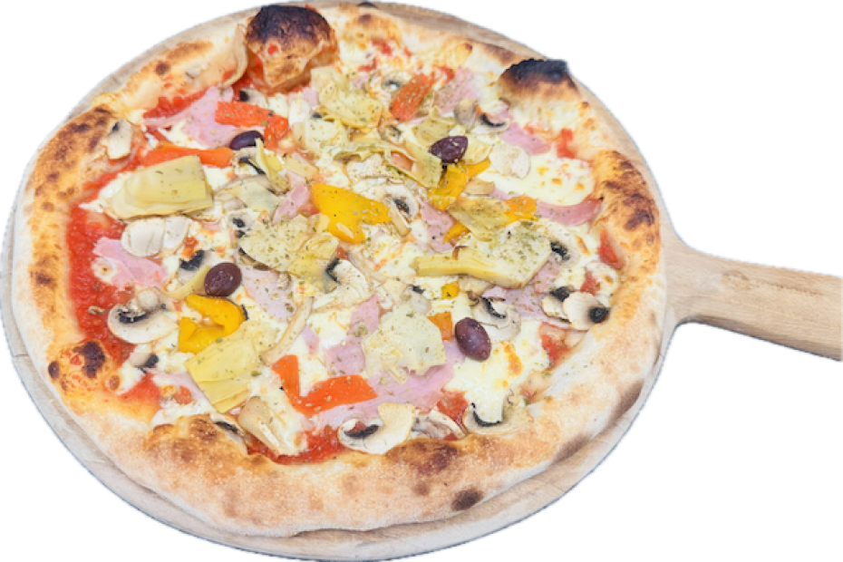 Tomate, mozzarella Fiore di latte, jambon, champignons, poivrons, artichauts, olives, origan.
