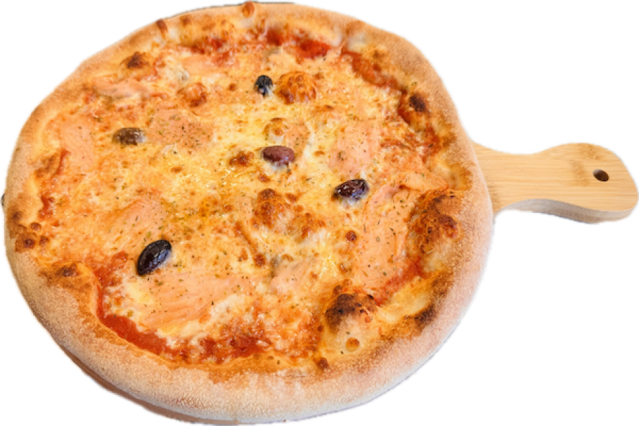 Tomate, mozzarella Fiore di latte, saumon, crème fraîche, olives, origan.