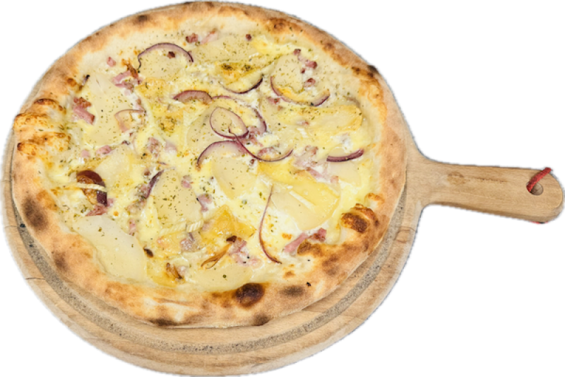 Crème fraîche, mozzarella Fiore di latte, pomme de terre, lardons, roblechon, oignons, origan.
