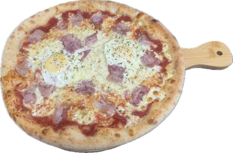 Tomate, mozzarella Fiore di latte, 2 oeufs, bacon grillé, origan.