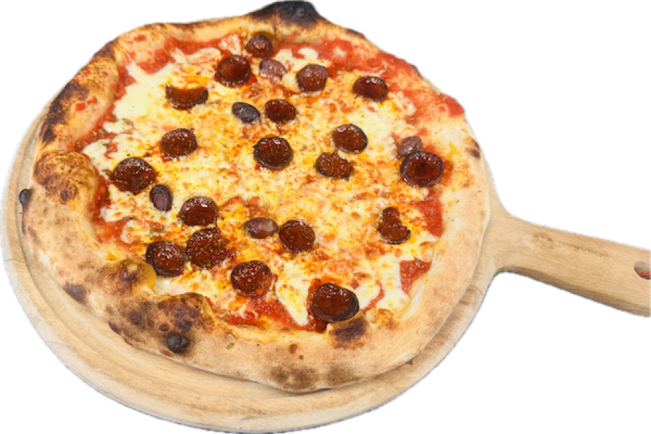Tomate, mozzarella Fiore di latte, pepperoni, olives, origan.