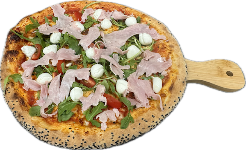 Pate avec des graines de sesame, tomate, mozzarella Fiore di latte, jambon cuit, roquette, tomate en des, boule de mozza di Buffala, origan
