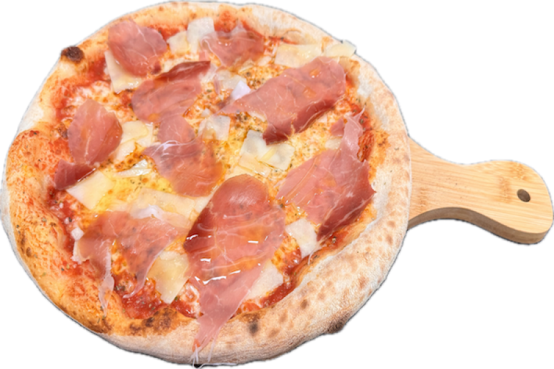 Sauce tomate maison, mozzarella Fiore di latte, jambon serrano, grana, huille de truffe.