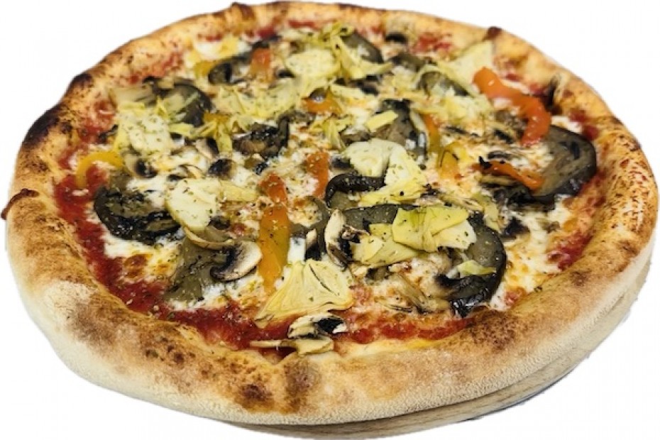 Tomate, mozzarella fiore di latte, aubergines, poivrons, champignons, artichauts, origan, persillade.