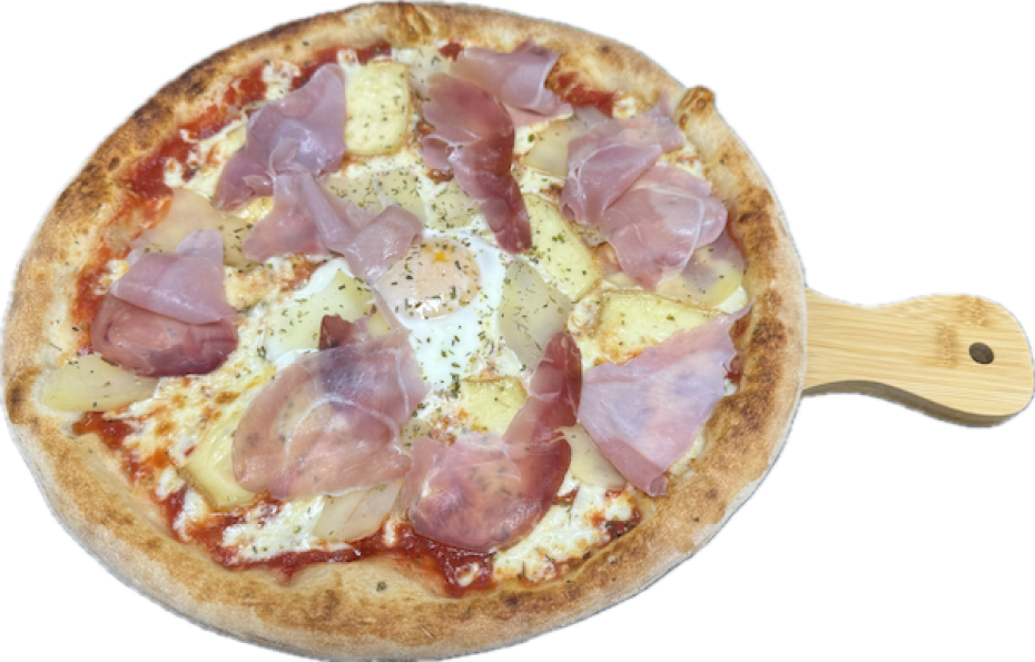 Tomate, mozzarella Fiore di latte, pomme de terre, fromage à raclette, jambon Seranno a la coupe, oeuf, origan.