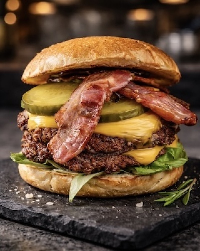 Salade, tomate, oignons, steak smashé, cheddar, pickles.